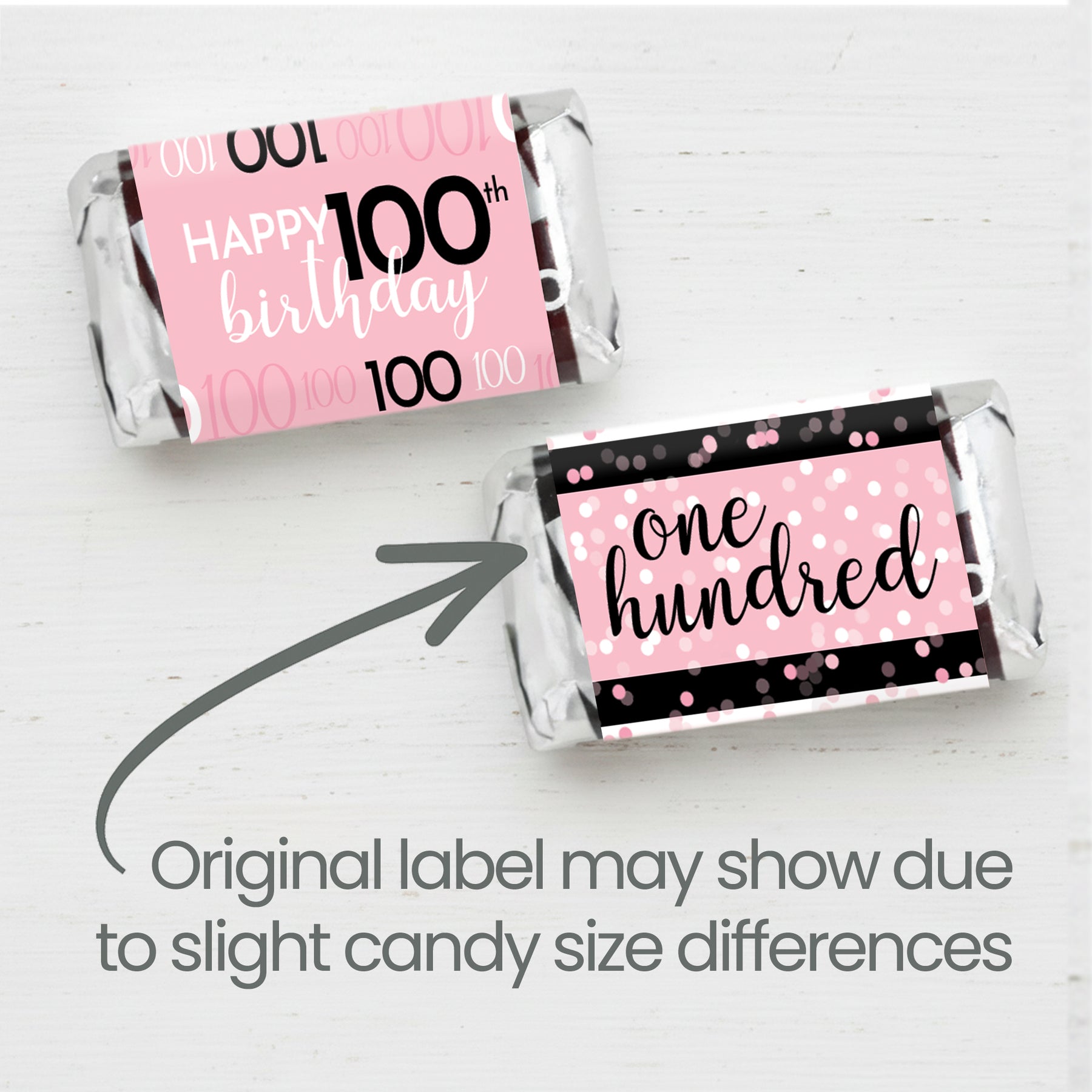These Pink, Black, and White 100th Birthday Mini Candy Bar Wrapper Stickers have been created to impeccably complement your pink-themed, happy 100th birthday celebration decorations and party supplies.