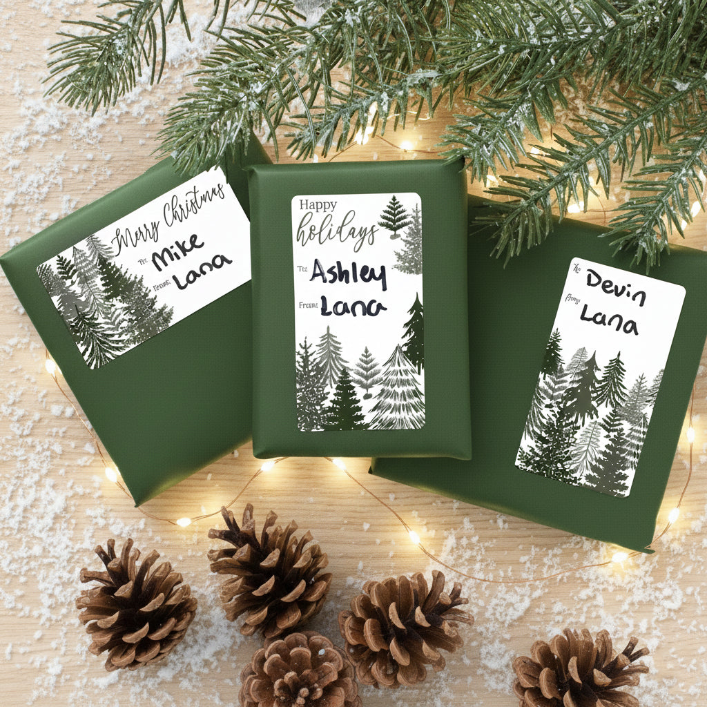 Christmas Gift Tag Stickers: Evergreens on White – 42 Labels