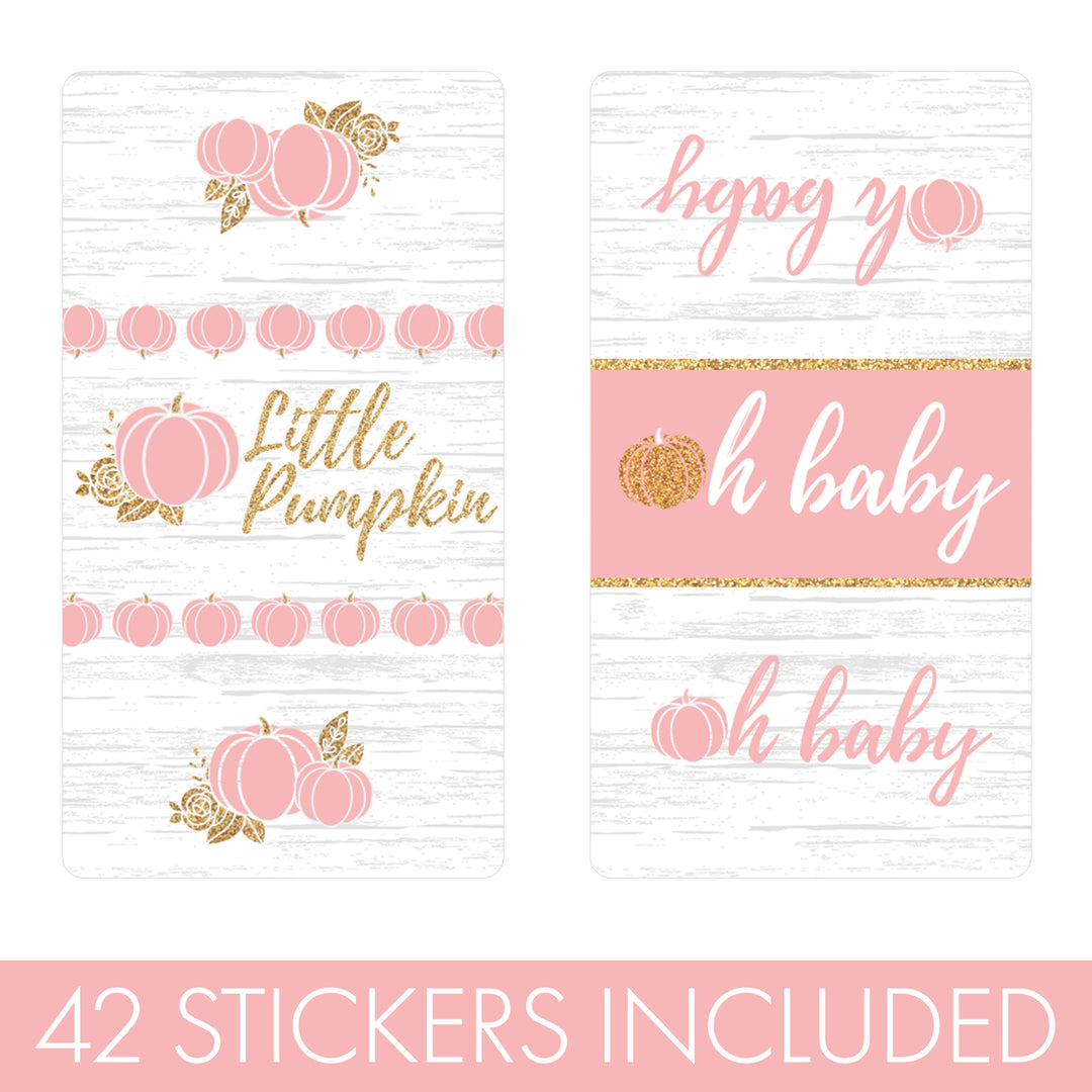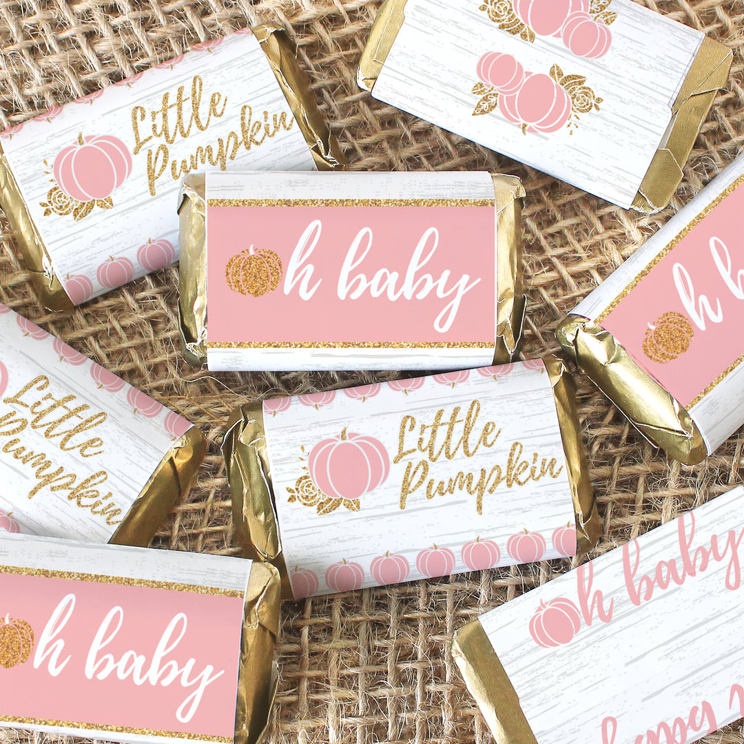 These pink and gold oh baby little pumpkin baby shower favor stickers are made to wrap around Hershey’s® Miniatures Candy Bars.