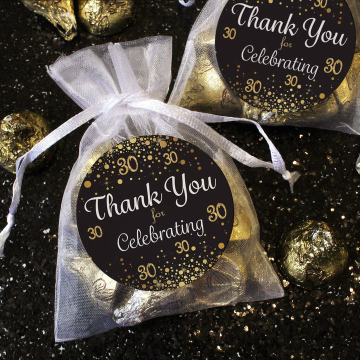 Transform your 30th birthday party event with our exquisite collection of Black and Gold party favor stickers. Each sticker is adorned with a captivating gold sparkle design that exudes luxury! The best part is the sparkle is printed to replicate the shimmer of glitter without any of the mess. Perfect for adding a touch of glamour to your party favors, these stickers combine the timeless elegance of black with the opulent allure of gold, ensuring a sophisticated and hassle-free celebration.