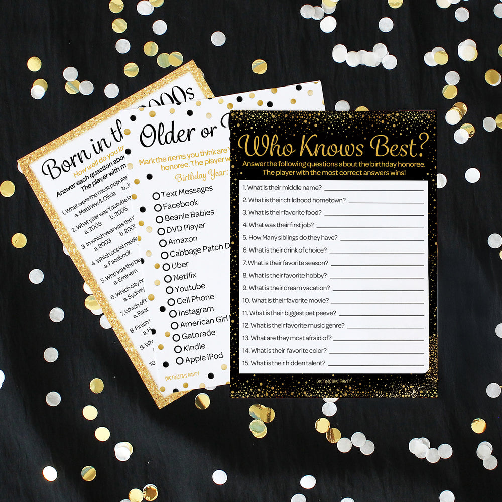 Celebrate your loved one's birthday who was born in the years 2000 through 2009 celebrating 16th, 18th, 21st Birthdays or any age in between with our Born in the 2000s Black & Gold Birthday Game Bundle!
