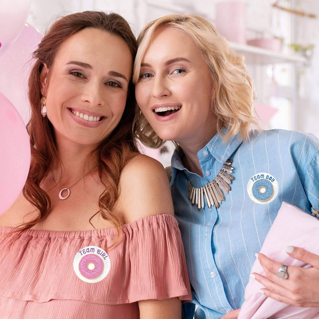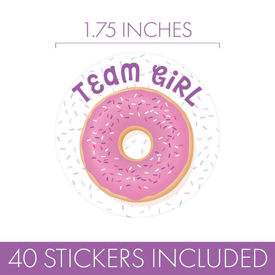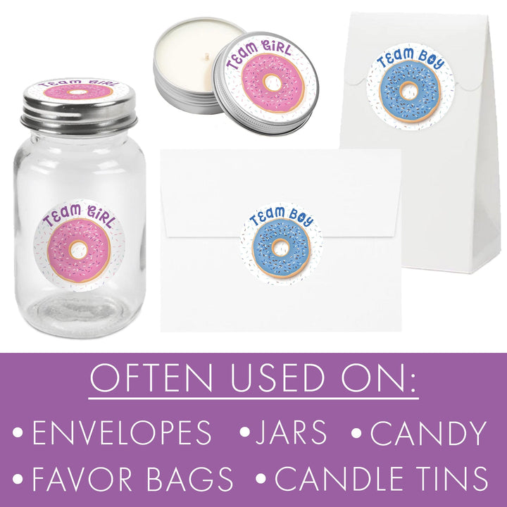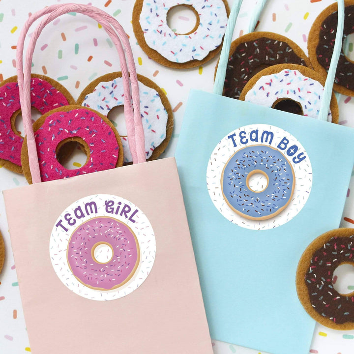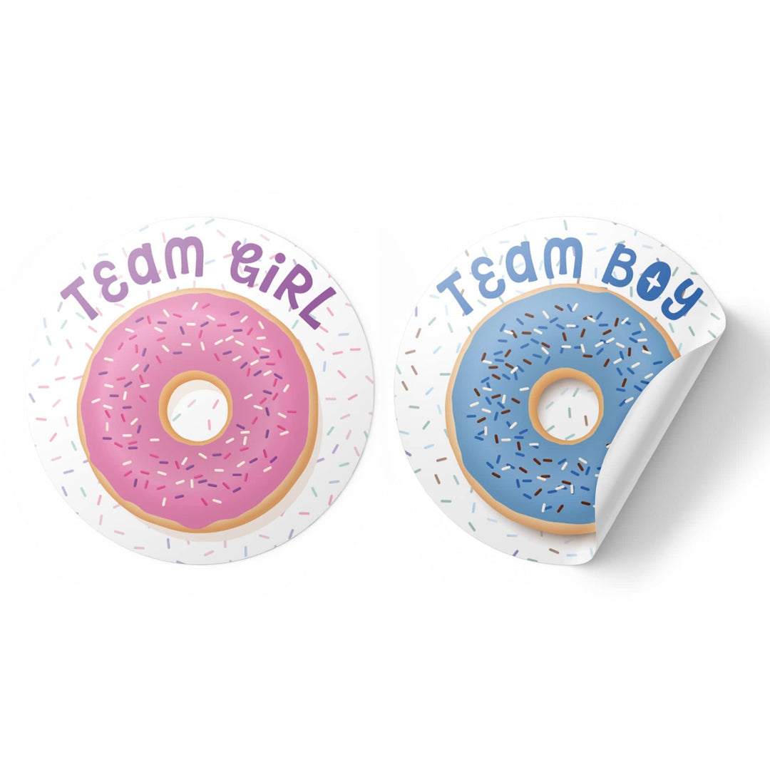 Estas pegatinas del equipo de revelación de género de donuts serán el complemento perfecto para la decoración de tu fiesta de revelación de género de bebé We Donut Know What You Are.