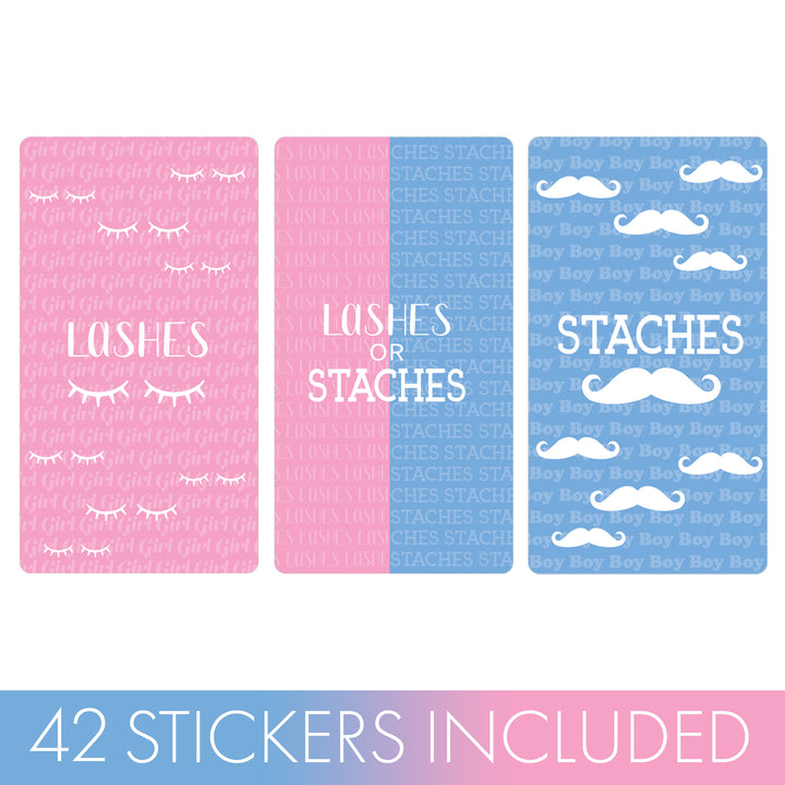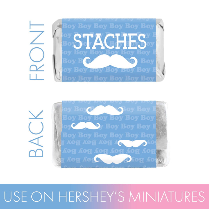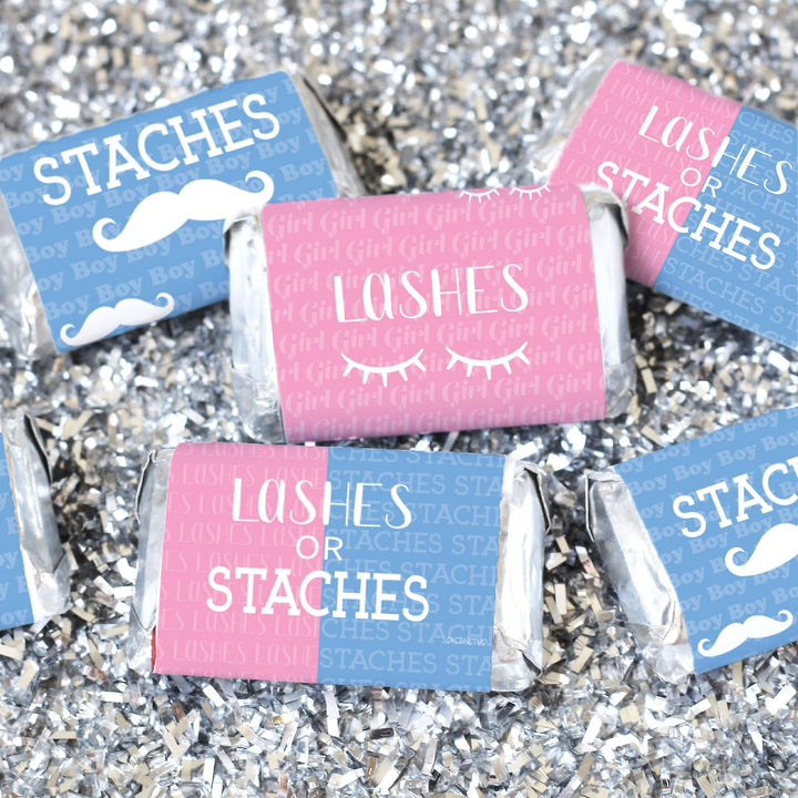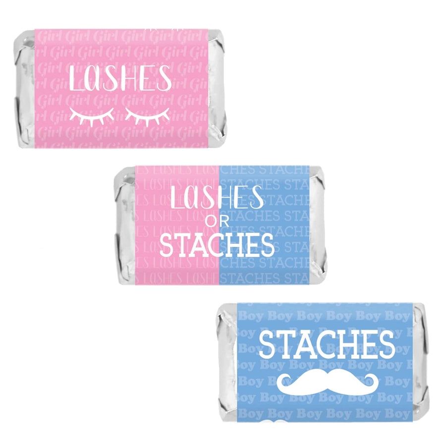 Estas pegatinas para regalos de fiesta que revelan el género del bebé con pestañas o bigotes están hechas para envolver alrededor de las barras de chocolate en miniatura de Hershey's®.
