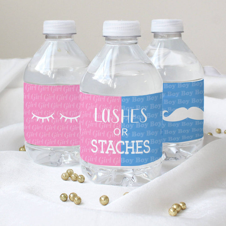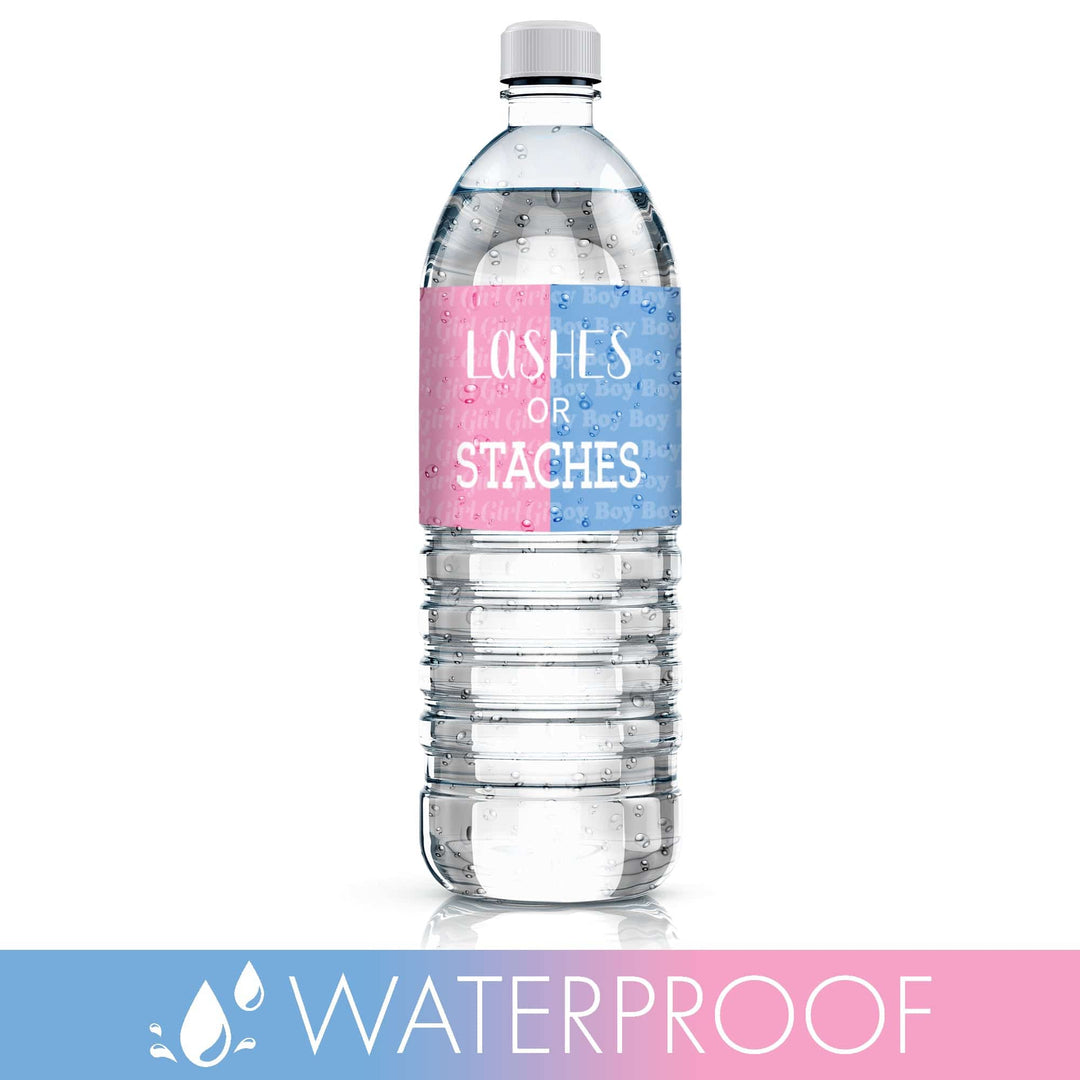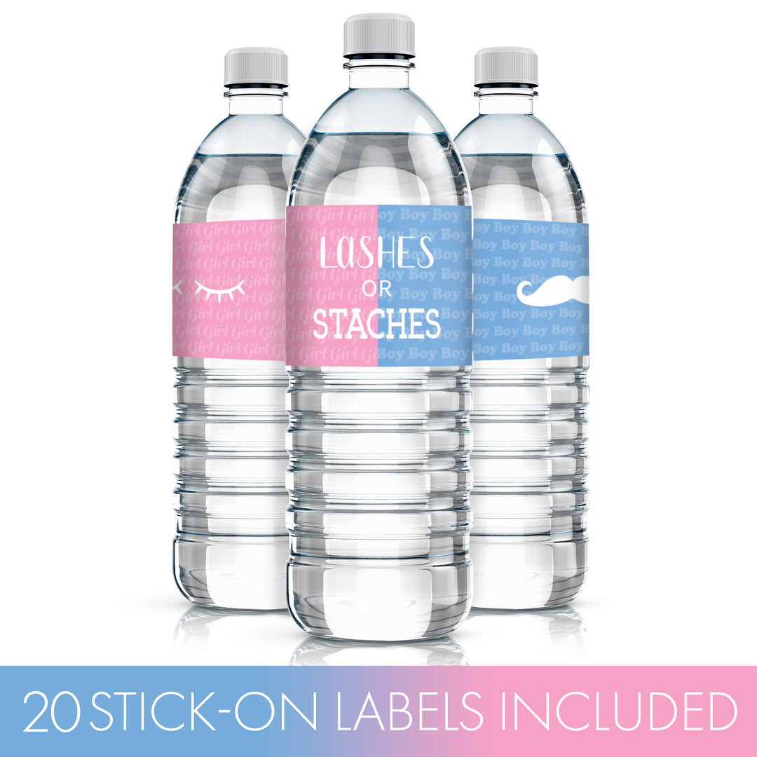 Estas etiquetas para botellas de agua con pestañas o bigotes que revelan el género convierten los refrigerios básicos de tu fiesta en obsequios fáciles para la fiesta.