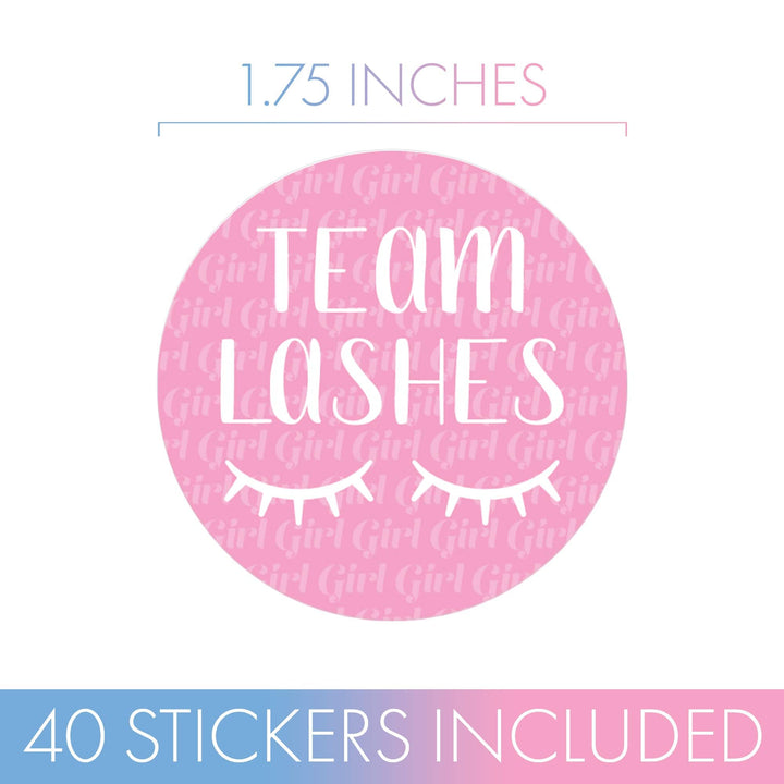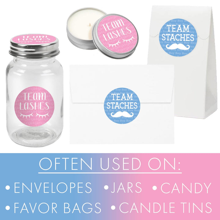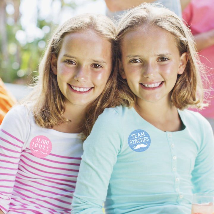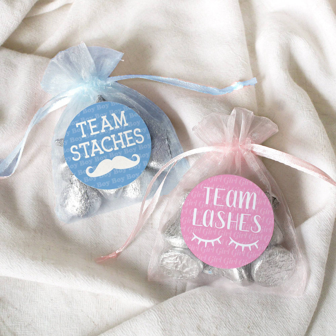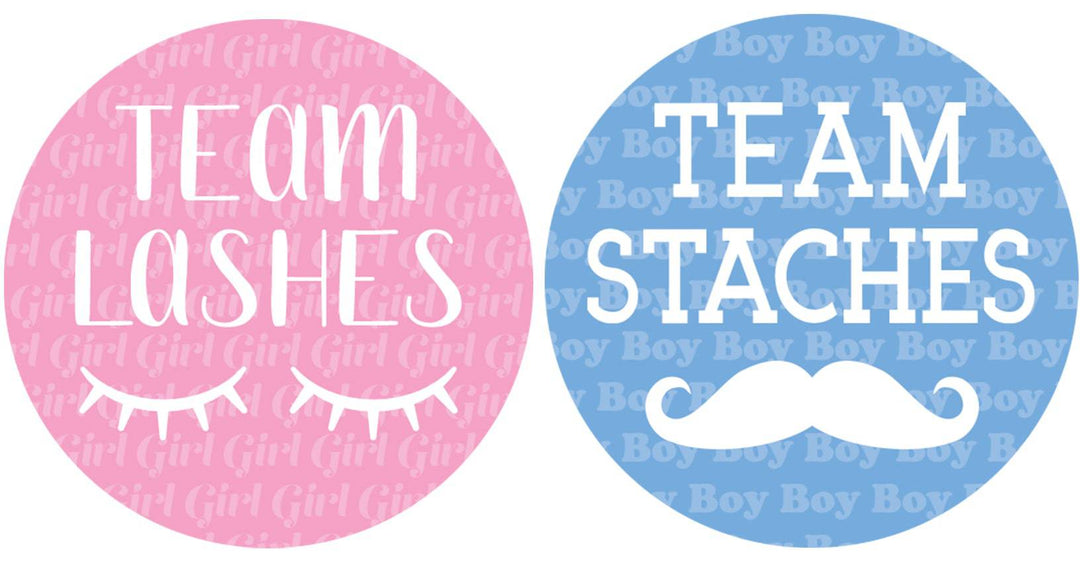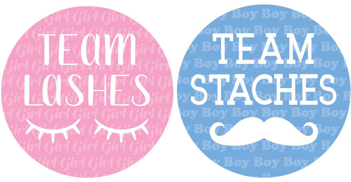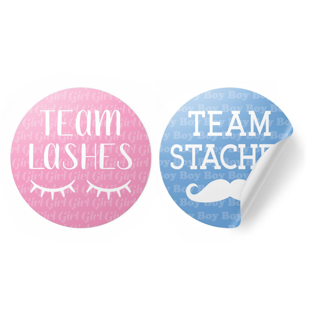 Estas pegatinas del equipo de revelación de género del bebé con pestañas o staches serán el complemento perfecto para la decoración de tu fiesta.