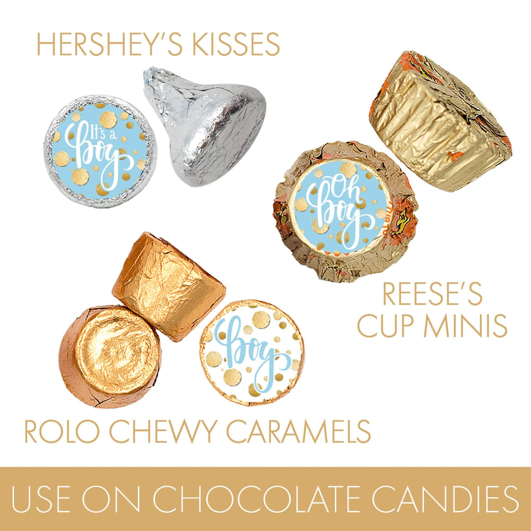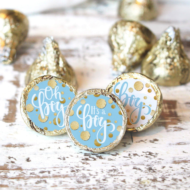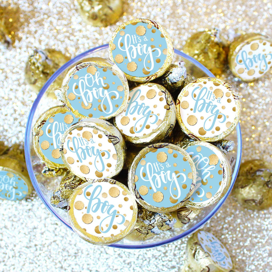 Estas pegatinas azules y doradas para baby shower son el detalle final perfecto para agregar a tu próximo baby shower de niño.