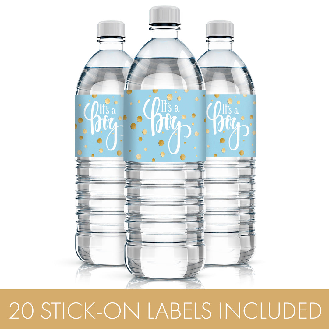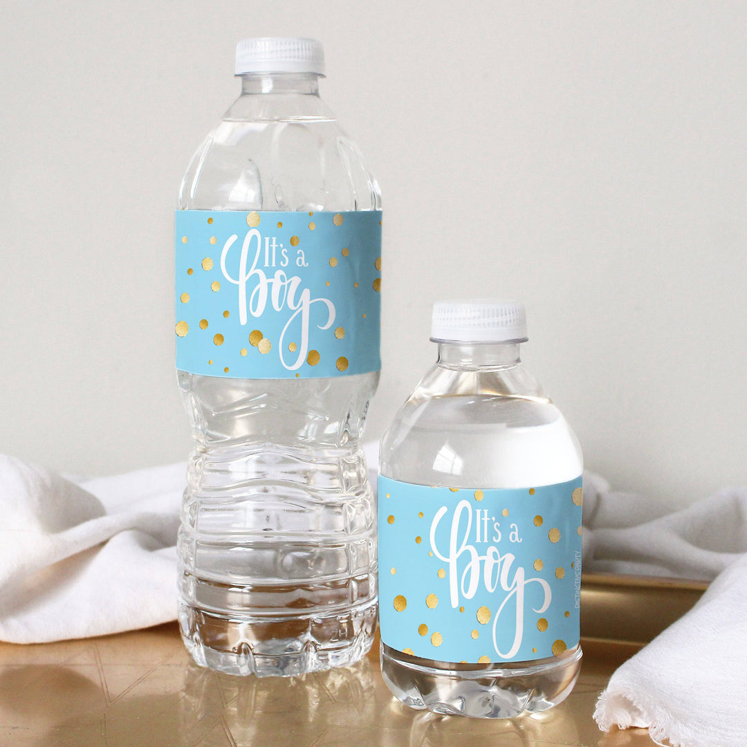 Estas etiquetas azules y doradas para botellas de agua para baby shower de niño convierten los refrigerios básicos de tu fiesta en obsequios fáciles para la fiesta.