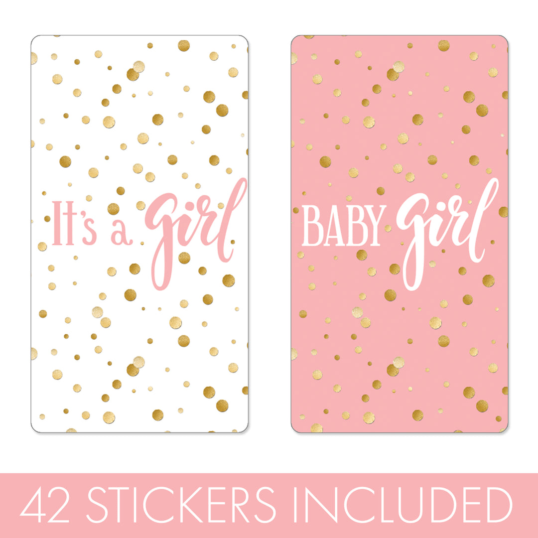 Estos baby shower rosas y dorados de It's a Girl Las pegatinas están hechas para envolver perfectamente las barras en miniatura de Hershey's®.