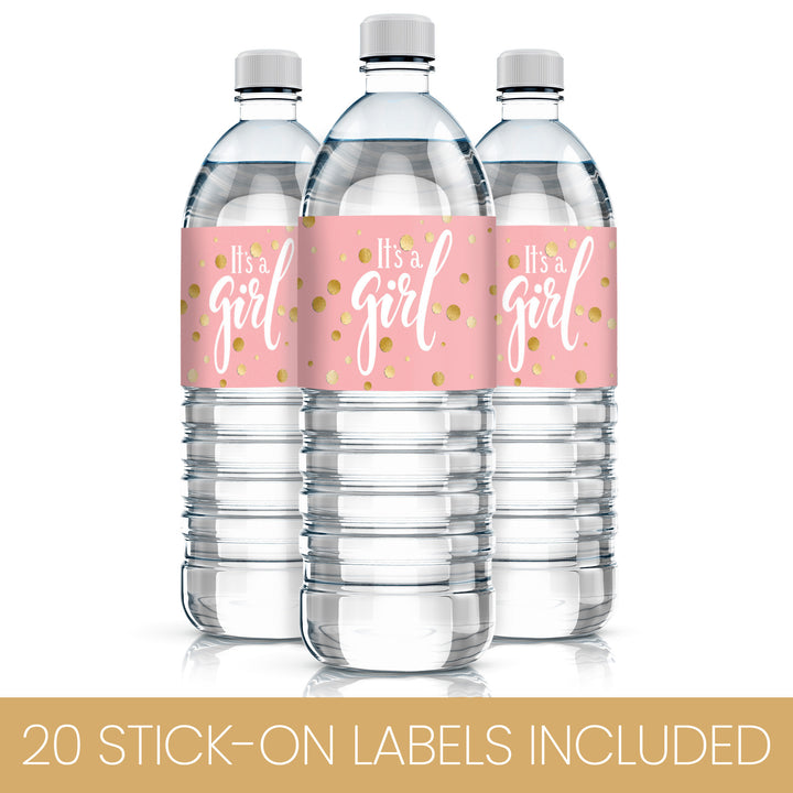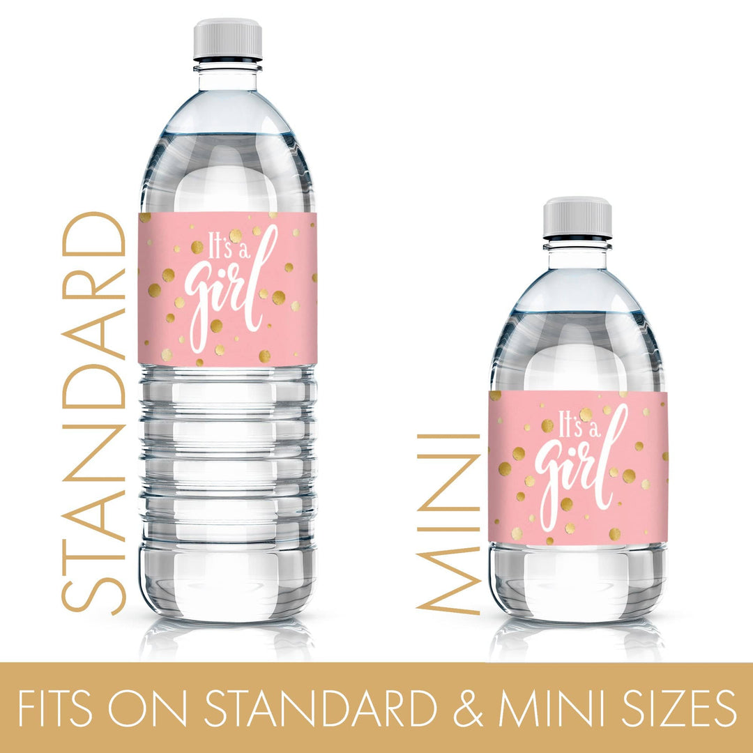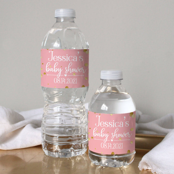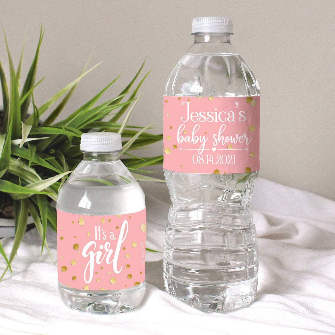 Estas etiquetas rosadas y doradas para botellas de agua para baby shower de niña convierten los refrigerios básicos de tu fiesta en obsequios fáciles para la fiesta.