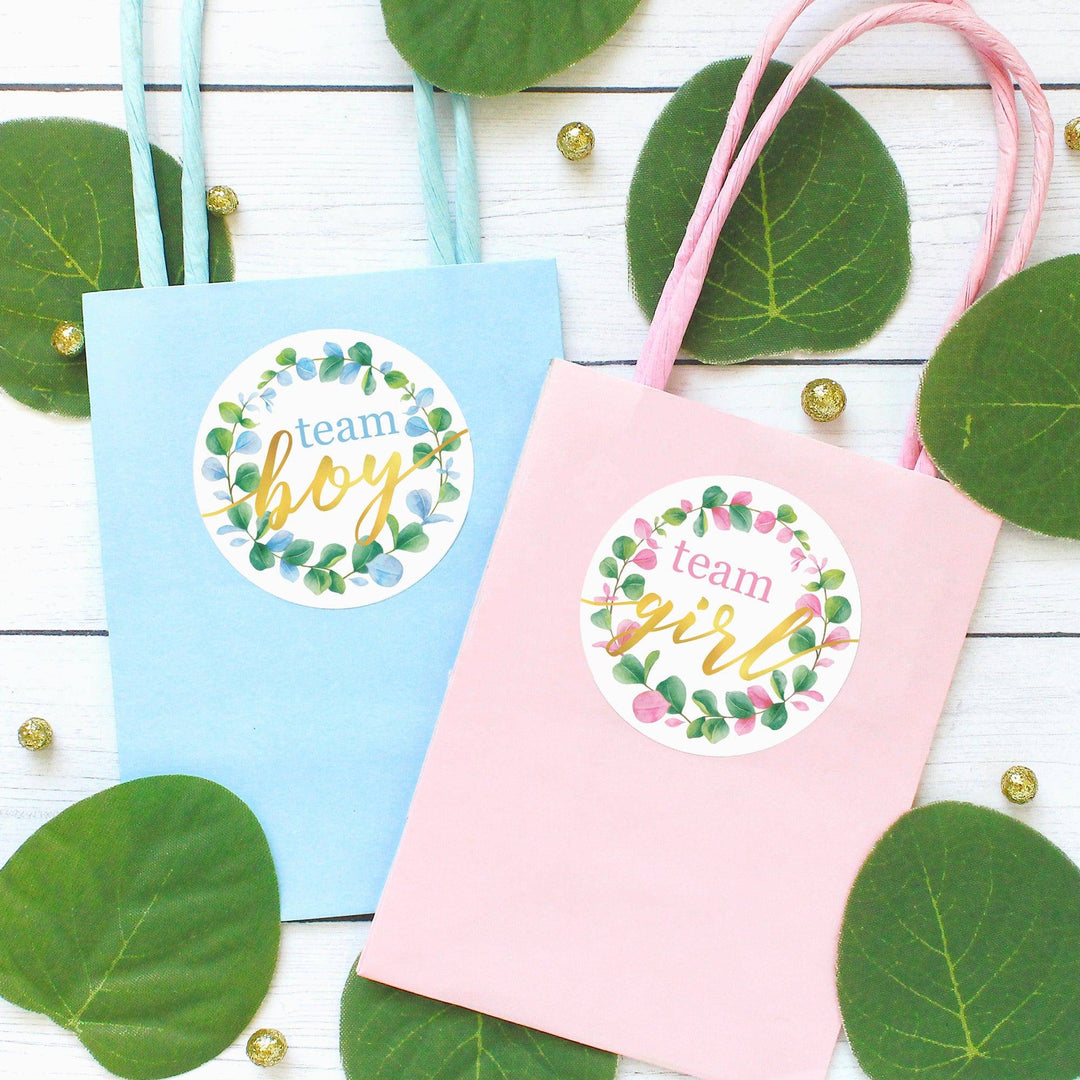 Estas pegatinas de fiesta de revelación de género de Eucalyptus Greenery serán el complemento perfecto para tu Greenery. Decoraciones de fiesta de revelación de género con temática de eucalipto o jardín . Ofrezca a los invitados una forma divertida de adivinar quién será el pequeño y elija pegatinas azules del chico del equipo o rosas del equipo chica.