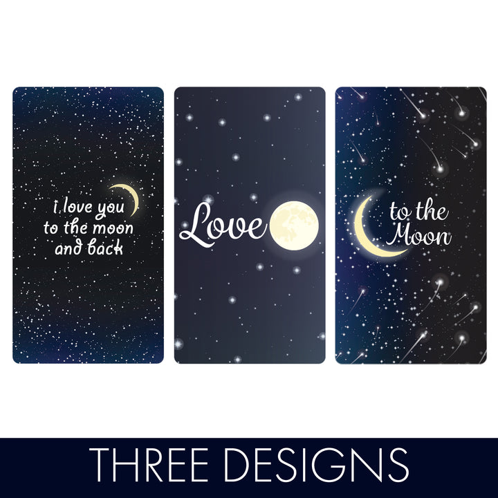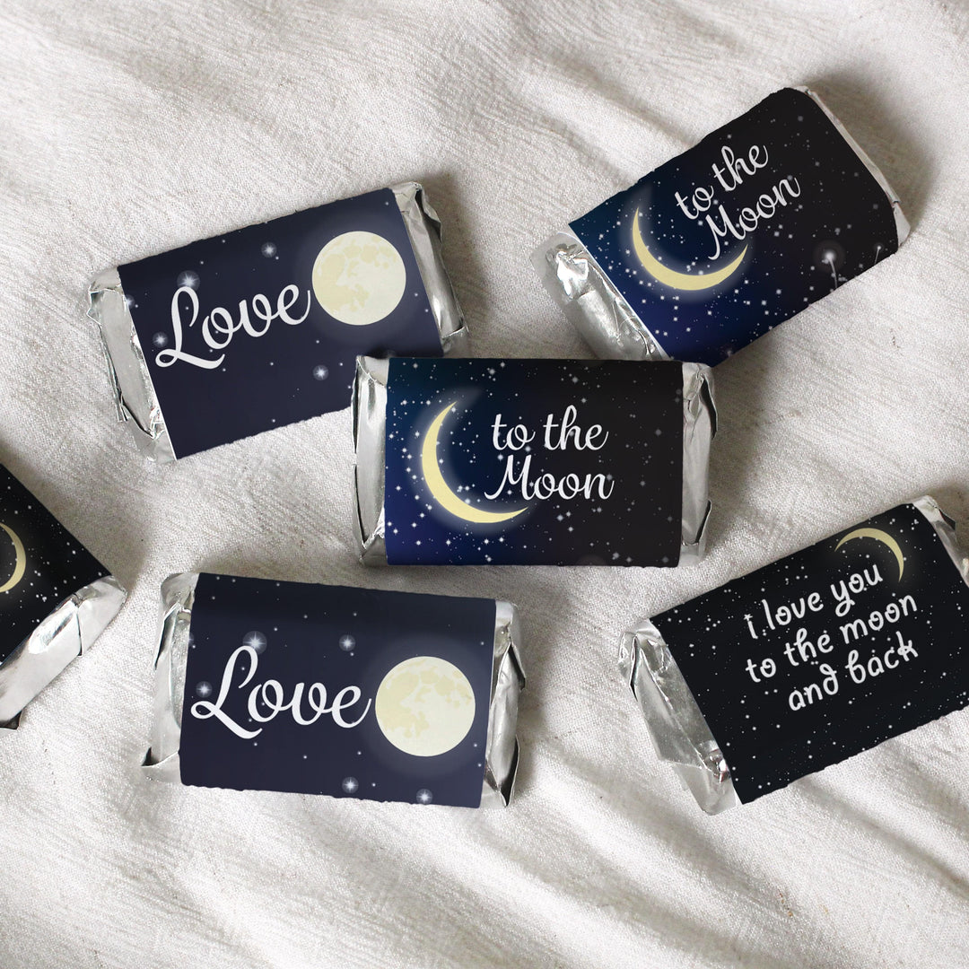 Estas calcomanías de recuerdo de fiesta de Te amo hasta la luna y la espalda están hechas para envolver alrededor de las barras de chocolate en miniatura de Hershey's® para un baby shower con estrellas centelleantes o una despedida de soltera enamorada sobre la luna.
