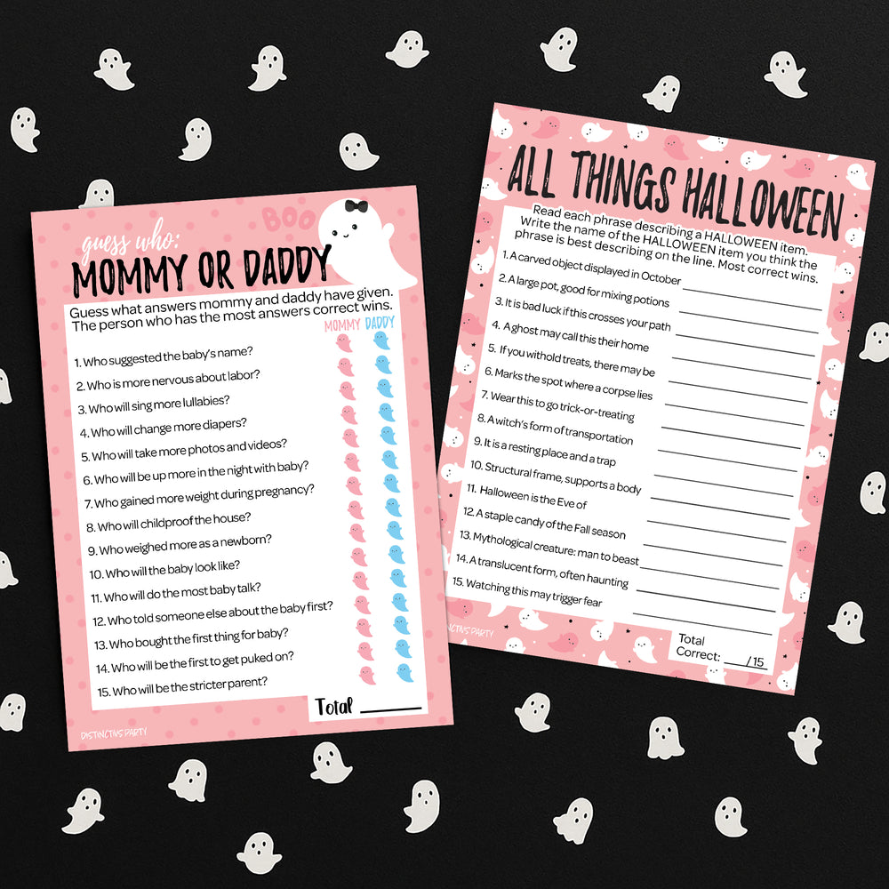 ¡Estos espeluznantes juegos de baby shower Pink Little Boo son una opción fascinante para tu baby shower con temática de Halloween! Este paquete incluye 20 cartas de juego de doble cara con un tono rosado, un lindo diseño de fantasma y el divertido motivo "Little Boo", ¡lo que las hace perfectas para agregar un toque de magia de Halloween!