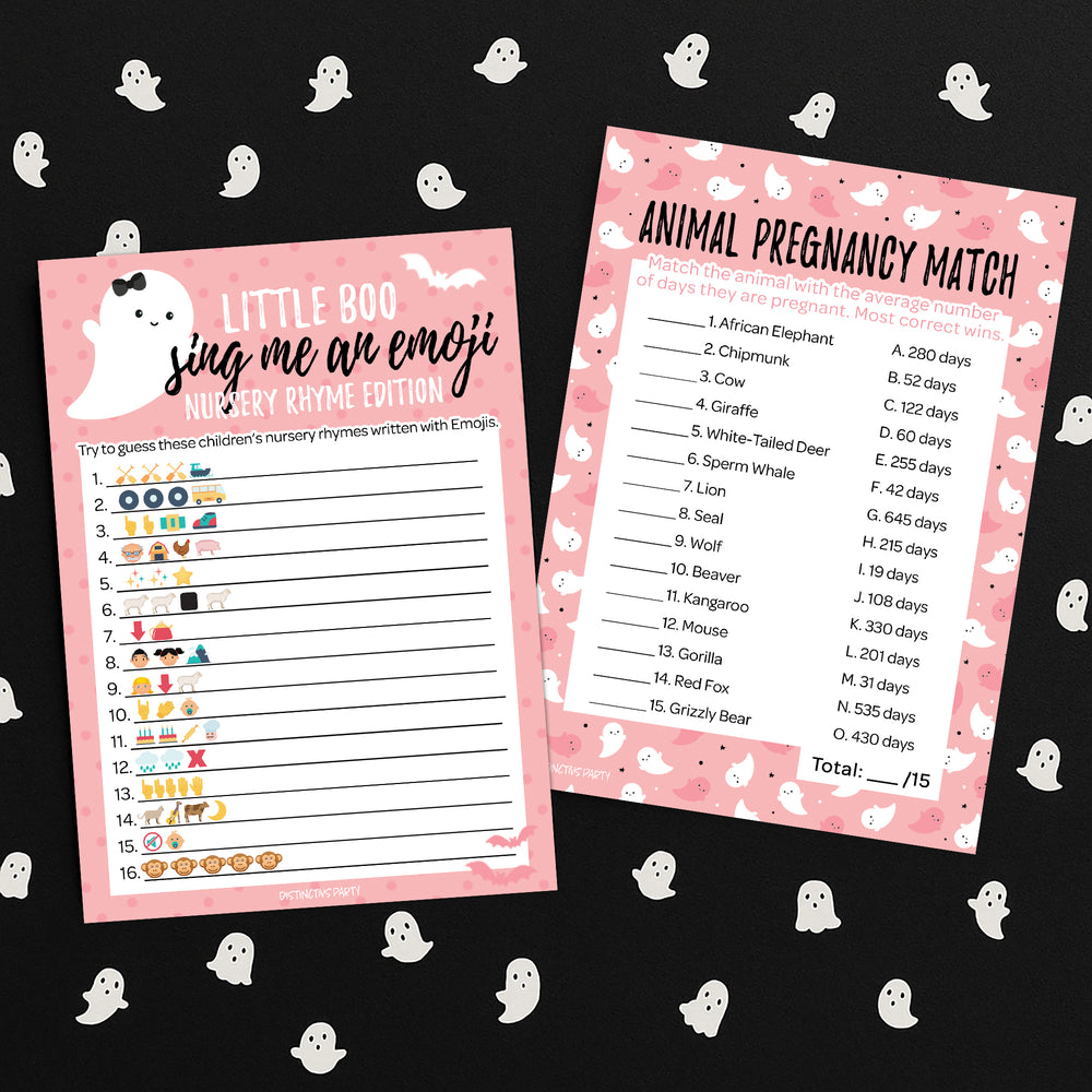 ¡Estos espeluznantes juegos de baby shower Pink Little Boo son una opción fascinante para tu baby shower con temática de Halloween! Este paquete incluye 20 cartas de juego de doble cara con un tono rosado, un lindo diseño de fantasma y el divertido motivo "Little Boo", ¡lo que las hace perfectas para agregar un toque de magia de Halloween!