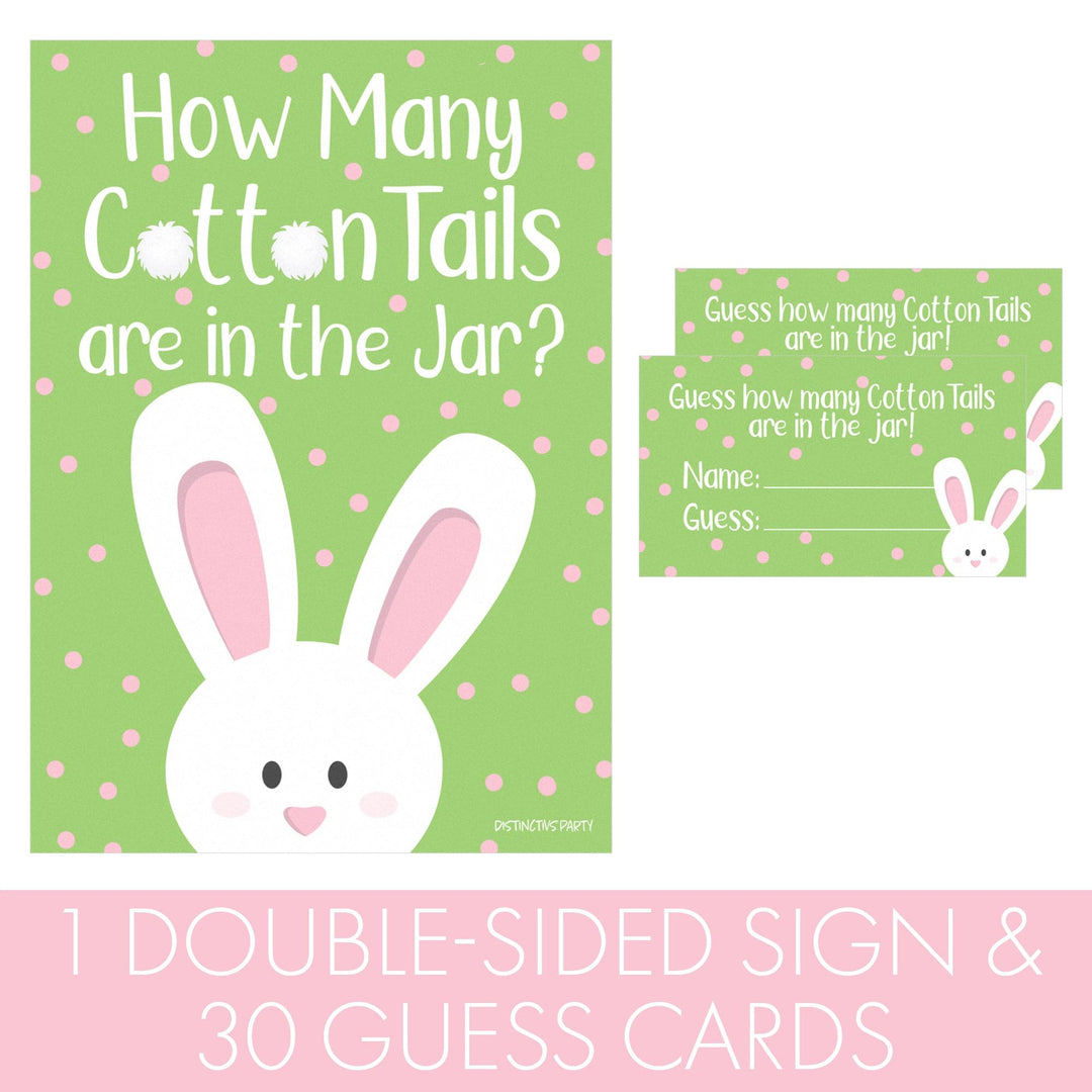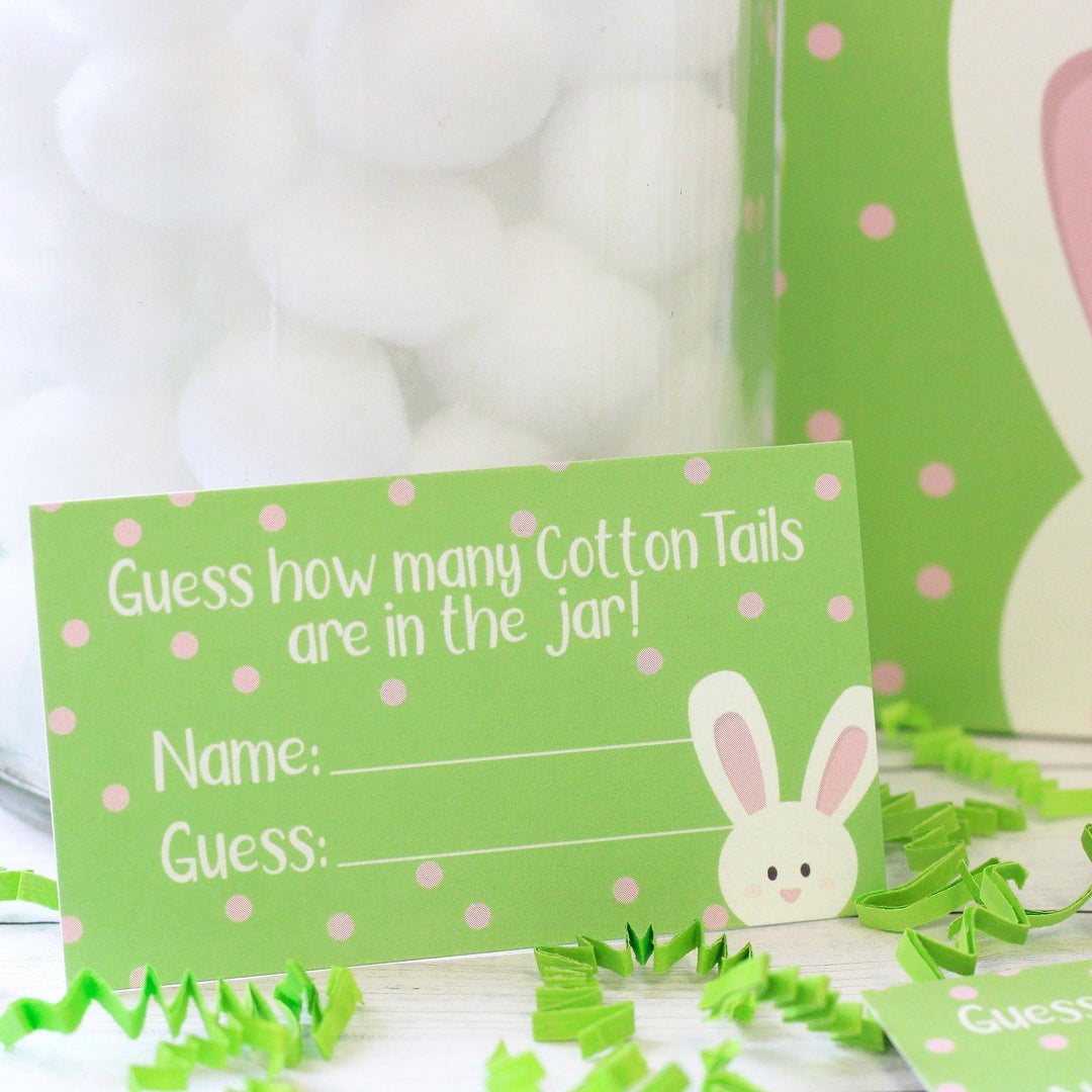 Utilice este juego de Pascua sobre cuántas colas de algodón como un divertido juego de fiesta para los invitados a una fiesta del domingo de Pascua en abril. Para una actividad divertida en la fiesta, pida a los invitados que escriban su estimación de cuántas bolas de algodón hay en un frasco (no incluido). ¡El invitado más cercano gana!