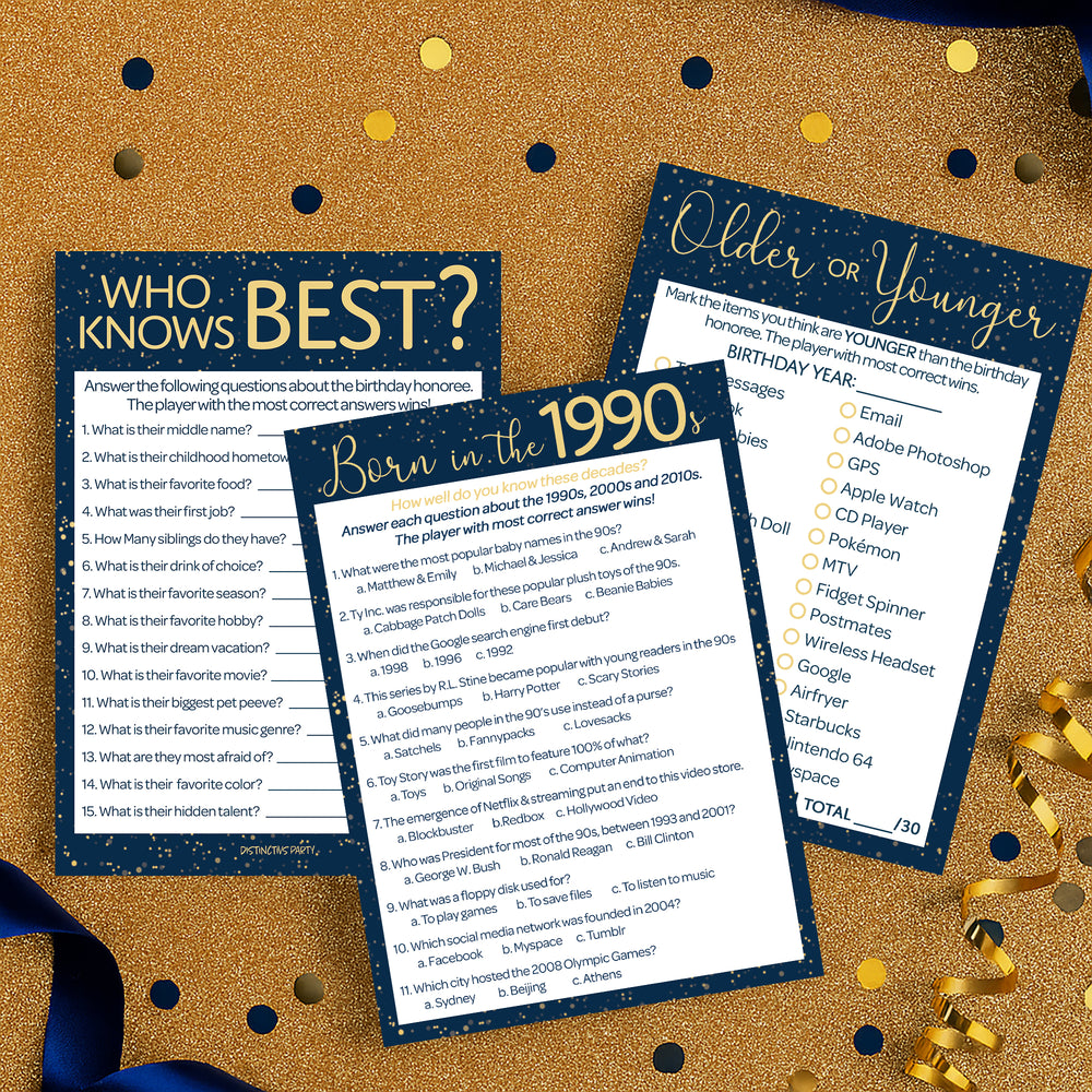¡Celebre el cumpleaños de su ser querido que nació entre los años 1990 y 1999 celebrando los cumpleaños 21, 25, 30 o cualquier edad intermedia con nuestro paquete de juegos de cumpleaños azul marino y dorado Born in the 1990s! ¡Muéstrale a tu amigo de cumpleaños que la edad no es más que un número!