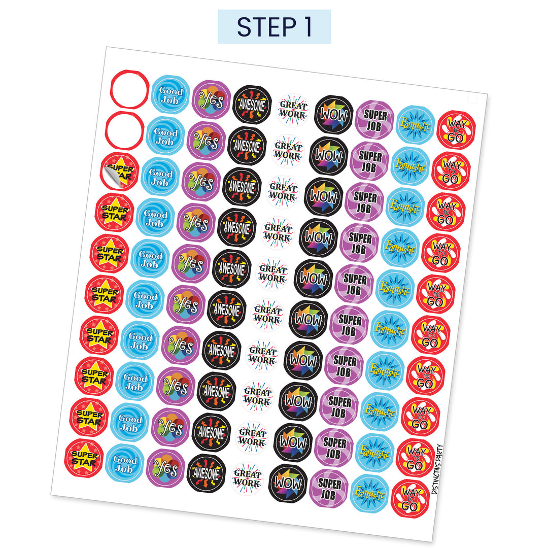 Remove the small sticker (0.75 inches - about the same size as a penny) from our easy peel sheet with gentle and steady movements. The easy peel stickers are designed for a hassle-free experience, allowing you to effortlessly lift the stickers from the sheet without fuss.