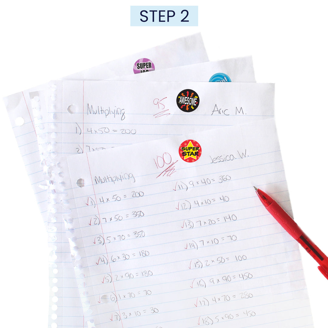 Apply the reward sticker to graded papers as a positive and encouraging touch. Choose a prominent and visible spot on the paper, such as the top or bottom corner, to showcase the student's achievement. The addition of a reward sticker not only recognizes their effort but also adds a fun and motivational element to the grading process. This small gesture can go a long way in fostering a positive learning environment and encouraging students to take pride in their academic accomplishments.