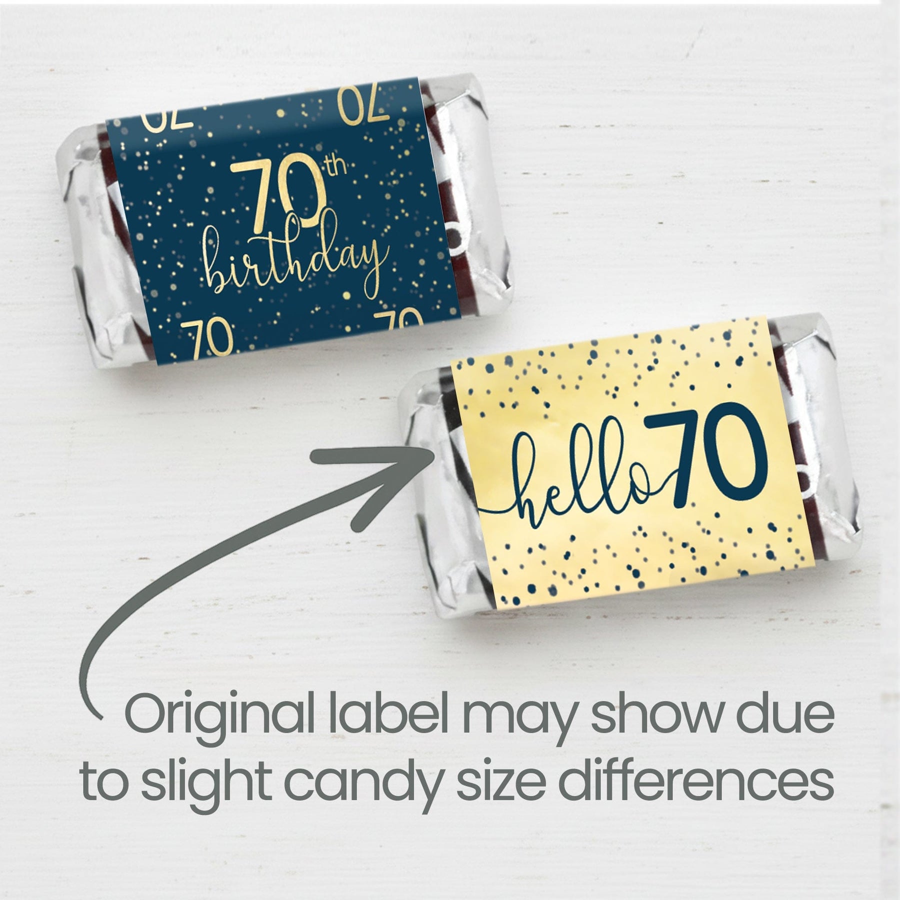 These Navy Blue and Gold 70th Birthday Mini Candy Bar Wrappers Stickers are designed to perfectly match your 70th birthday decorations and party supplies. The navy designs are printed on premium gold foil.
