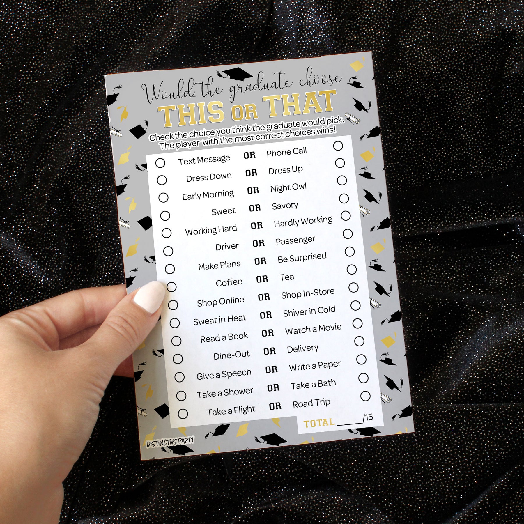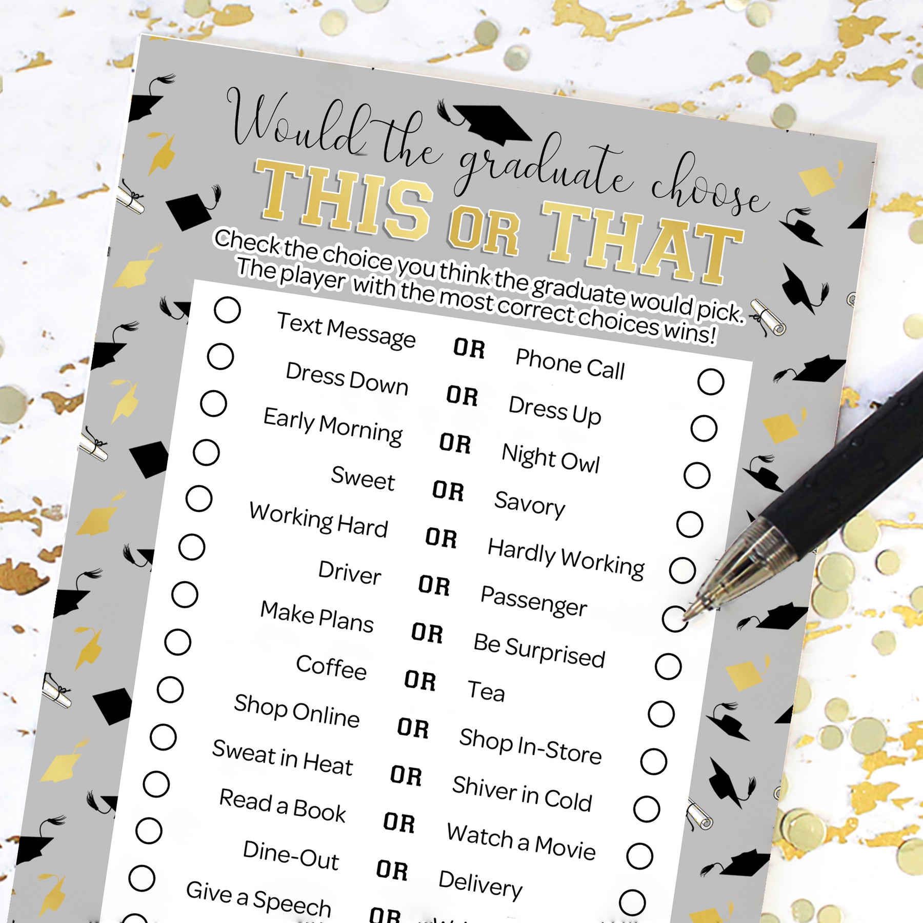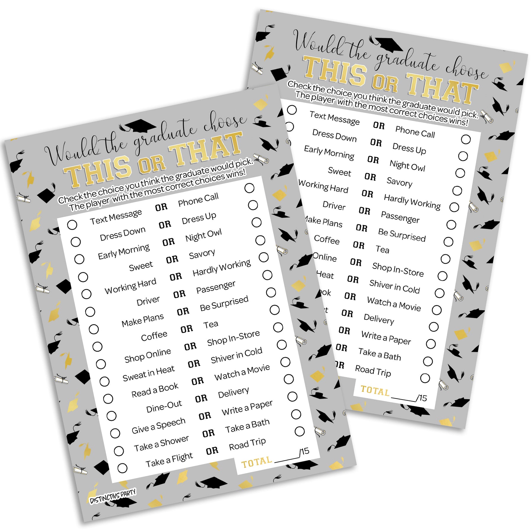 Guests are presented with paired choices—such as everyday preferences and fun personality-based options—and asked to guess which one the graduate would choose. Players can compete for the most correct answers or simply enjoy comparing responses, making this game a great conversation starter throughout the party.