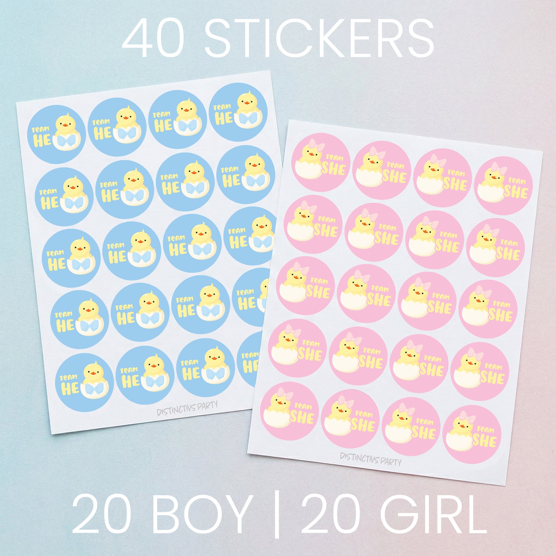Bring a touch of adorable charm to your Little Chick Gender Reveal Party with our Team He or Team She Stickers. This sweet set features little chicks nestled in eggs with soft pink and blue accents, creating a playful and cohesive look for your celebration.